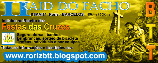 Pois é caros bttistas, a Associação Cultural e Recreativa de Roriz - Barcelos tem o prazer de anunciar a 2ª edição deste grande evento e que conta com algumas boas novidades em relação ao ano transacto. Para os amantes deste desporto, aconselho vivamente a participar, pois irão encontrar várias experiências, desde uma variedade de pisos e dificuldades, até aos trilhos a rasgar as mais belas paisagens desta zona passando também por descidas técnicas para os mais ousados assim como alternativas para os menos experientes. Mas palavras para quê?!! Inscreve-te já e confirma a tua presença na companhia da tua fiel amiga. Tornámos este evento também acessível a todos e baixamos o valor da inscrição para 7€. * Evento incluído no roteiro das Festas das Cruzes 2011